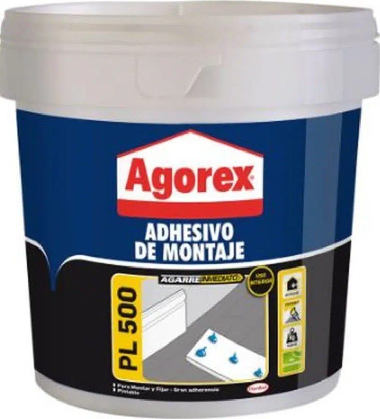 Adhesivo para montar y fijar molduras de madera, molduras de poliestireno expandido, placas decorativas, paneles de madera, listones de zócalos, guardapolvos, ladrillos, placas aislantes de poliestireno expandido, perfiles y ductos de PVC, sobre superficies absorbentes.